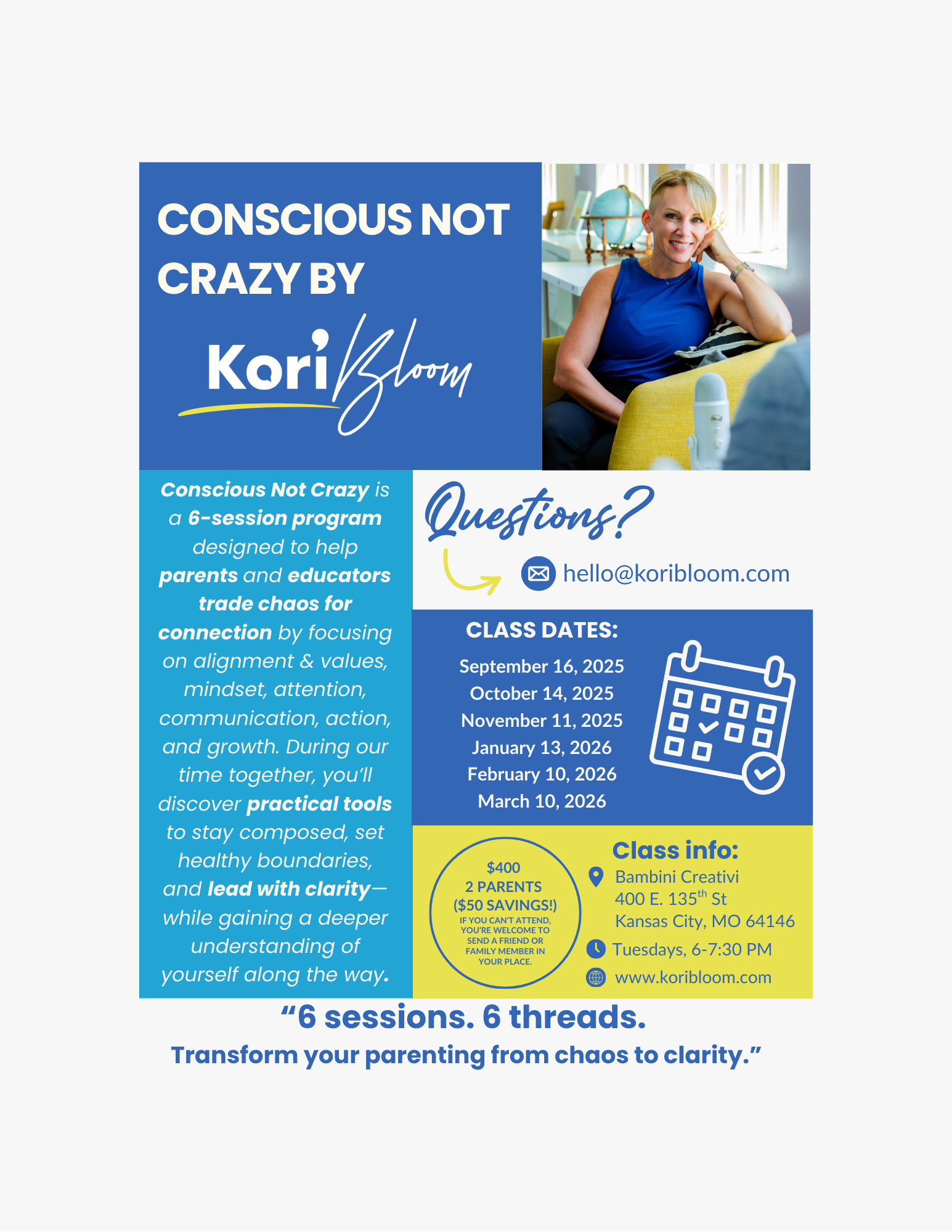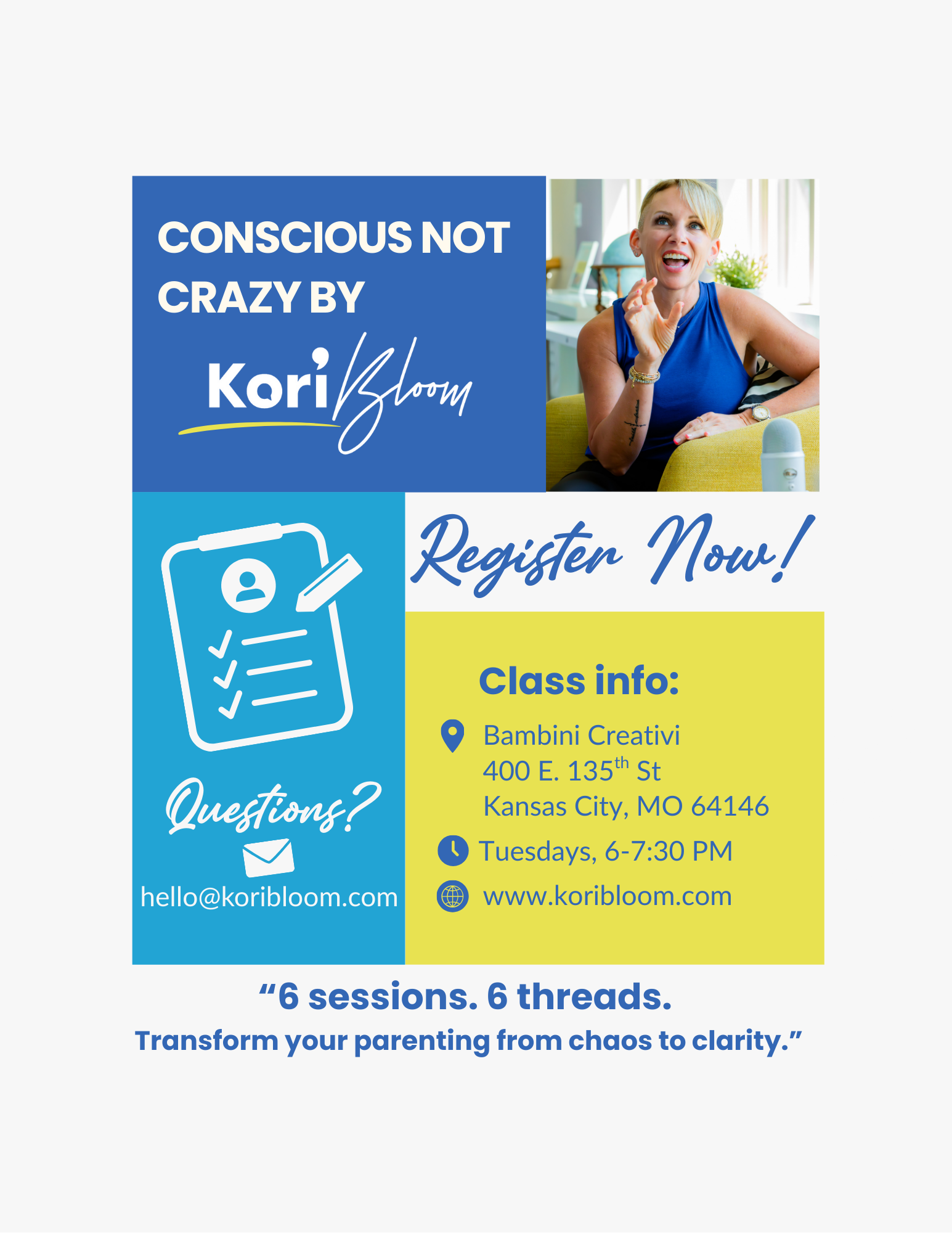 In-Person Conscious Not Crazy Program Conscious Not Crazy 6-Session Program (All 6 Sessions-2 Parents) $400.00 Sold out Sold Out Added! Conscious Not Crazy Registration 9/16/2025-Individual $50.00 Sold out Sold Out Added! Conscious Not Crazy Registration 9/16/2025-Couple (2 Parents) $75.00 Sold out Sold Out Added! Conscious Not Crazy Registration 10/14/2025-Individual $50.00 Add To Cart Added! Conscious Not Crazy Registration 10/14/2025-Couple (2 Parents) $75.00 Add To Cart Added! Conscious Not Crazy Registration 11/11/2025-Individual $50.00 Add To Cart Added! Conscious Not Crazy Registration 11/11/2025-Couple (2 Parents) $75.00 Add To Cart Added! Conscious Not Crazy Registration 1/13/2026-Individual $50.00 Add To Cart Added! Conscious Not Crazy Registration 1/13/2026-Couple (2 Parents) $75.00 Add To Cart Added! Conscious Not Crazy Registration 2/10/2026-Individual $50.00 Add To Cart Added! Conscious Not Crazy Registration 2/10/2026-Couple (2 Parents) $75.00 Add To Cart Added! Conscious Not Crazy Registration 3/10/2026-Individual $50.00 Add To Cart Added! Conscious Not Crazy Registration 3/10/2026-Couple (2 Parents) $75.00 Add To Cart Added!